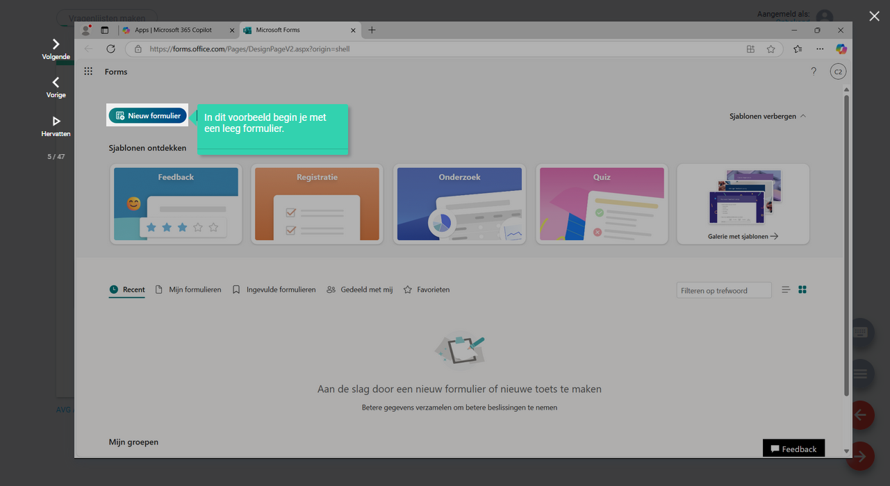 Wil je eenvoudig (digitale) enquêtes, quizzen en feedbackformulieren maken? Dat kan met Microsoft Forms. In het leerarrangement Integrated Learning Microsoft Forms leer je hoe je met deze applicatie effectieve vragenlijsten maakt, deze deelt met respondenten en waardevolle real-time inzichten verkrijgt via het resultatenoverzicht. Daarnaast ontdek je hoe je Forms kunt gebruiken in combinatie met andere Microsoft-toepassingen, zoals Power Automate.